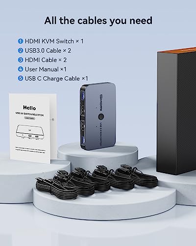【Package and Warranty】Our kvm switches comes with 2 pack 100cm(3.28ft) hdmi cable and 2 pack 120cm(3.94ft)usb 3.0 cables,no need to spend extra money on cables.What You Get: 1*KVM Switch, 2*HDMI cable, 2*USB 3.0 Cable,1*USB C power Cable, 1*User manual,If any issue,please contact us to solve,we provide 24-month warranty and 24h professional customer service and technical support.